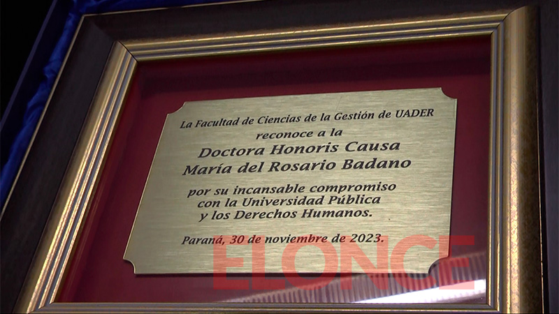 La magister María del Rosario Badano recibió el título de Doctora Honoris Causa por la Universidad Autónoma de Entre Ríos (UADER), registró Elonce. La distinción le fue otorgada en virtud de los sobrados antecedentes que acredita en los ámbitos de la educación y la política, como docente universitaria e investigadora y por su fuerte compromiso con la militancia política y social en materia de derechos humanos, según fundamentaron desde la casa de altos estudios.