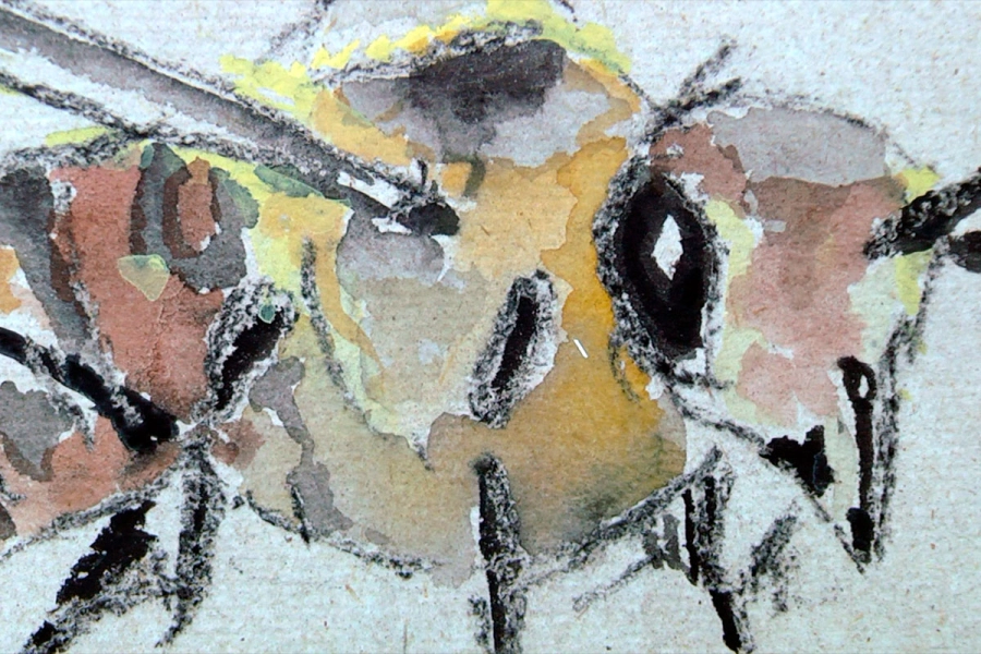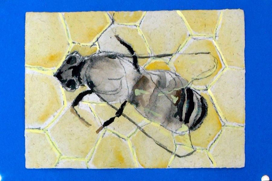 El artista Goran Medjugorac presentó una serie de obras dedicadas a las abejas eslovenas, realizadas sobre papel especial elaborado a partir de plantas invasivas. “Es una muestra inspirada en abejas eslovenas que, por el cambio climático, migran hacia el norte. Las pinté sobre un papel hecho con plantas invasivas originarias de Japón. En Eslovenia se intenta erradicarlas, y este es un modo de reutilizarlas”, explicó.
