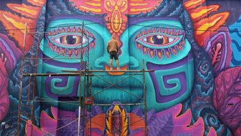 Desde fines de febrero muchos de los que han pasado caminando por calle Urquiza y San José han quedado sorprendidos por esa inmensa pared de colores que logró borrar de la memoria ese viejo gris que teñía a esa esquina de la ciudad. En la altura, entre los andamios, están Gurí y su amigo rionegrino Chechen, los artífices de esta obra de arte que hoy tendrá su última pincelada.