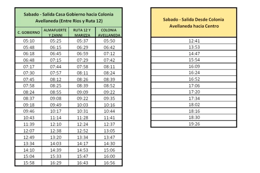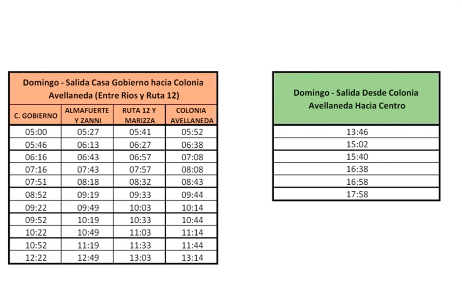 Los colectivos partirán desde Casa de Gobierno hacia Colonia Avellaneda a partir de las 5 de la mañana, tanto el sábado como el domingo, con frecuencia continua durante todo el día hasta la finalización de las competencias. El recorrido incluirá paradas en Almafuerte y Zanni, así como en Ruta 12 y Marizza, con retorno desde Colonia Avellaneda hacia el centro de Paraná.