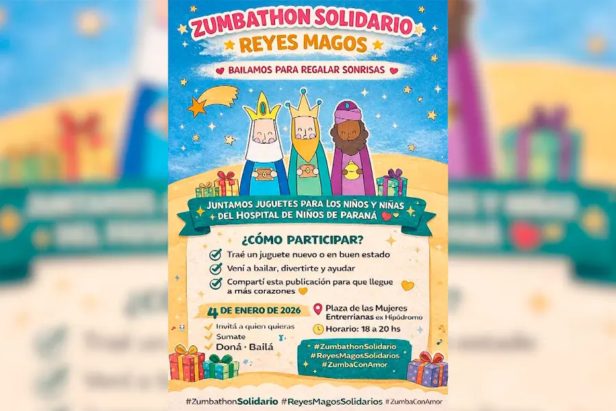 El próximo domingo 4 de enero, los paranaenses están invitados a participar de un zumbathon solidario por Reyes Magos para recolectar juguetes para el Hospital San Roque. El evento se llevará a cabo en la Plaza Mujeres Entrerrianas, de 18 a 20, y tiene como objetivo hacer sonreír a los niños internados, a través de la entrega de un juguete el día 6 de enero.