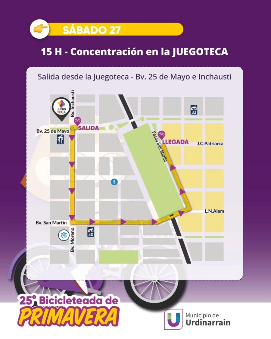 A las 15:00, se iniciará la Bicicleteada de Primavera, con punto de partida en la Juegoteca (esquina de Bv. 25 de Mayo y Bv. Inchausti).