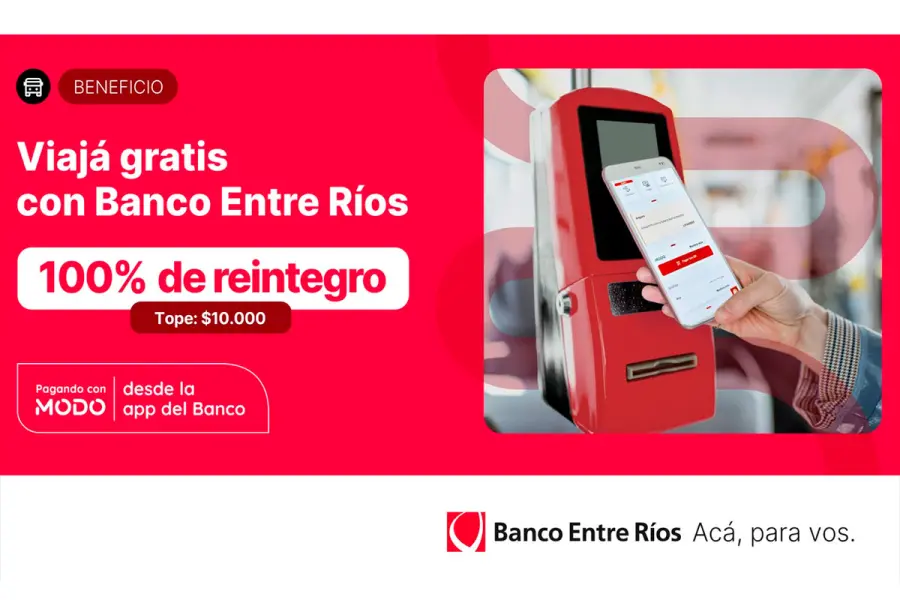 Bajo el lema “Viajá gratis con Banco Entre Ríos”, la promoción estará vigente hasta el 22 de febrero. Durante ese período, los usuarios que paguen sus viajes en colectivo utilizando MODO desde la app o desde la aplicación de Banco Entre Ríos recibirán un reintegro del 100% del importe, con un tope mensual de $10.000 por cliente.
