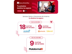 Hasta el domingo 20 de abril, los usuarios de Tarjetas de Crédito de Banco Entre Ríos pueden acceder a hasta 18 cuotas sin interés en Aerolíneas Argentinas y Almundo.com y 9 cuotas sin interés en Flybondi y Plataforma 10, para comprar sus pasajes y paquetes turísticos para destinos nacionales de manera cómoda y conveniente.
