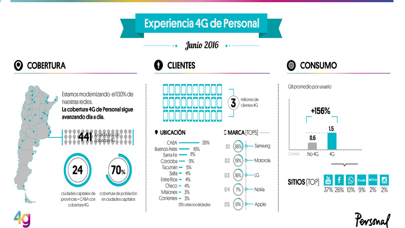 Además, Personal continúa el despliegue de la red 4G, con 3 millones de clientes que pueden vivenciar las velocidades de banda ancha móvil en todas las capitales de provincia y en más de 441 localidades del país.