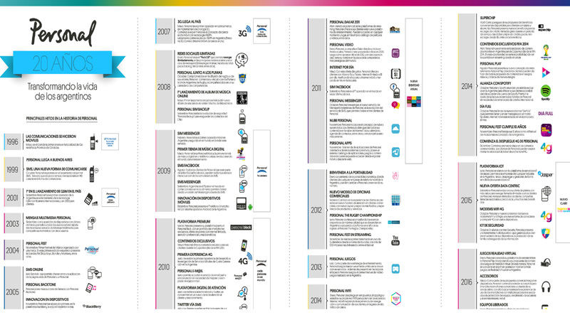 El recorrido de evolución tecnológica desde el encendido de la primera antena de telefonía móvil de Personal en 1996 hasta los actuales servicios de banda ancha móvil a través de la red 4G/LTE, está guiado por su espíritu innovador y disruptivo.