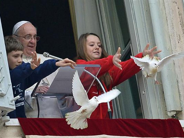 Las palomas fueron liberadas por un niño y una niña de Acción Católica de Roma, como es tradición en la Caravana de la Paz. Incluso Francisco los ayudó, en particular incitándolos a dirigirlas hacia lo bajo.