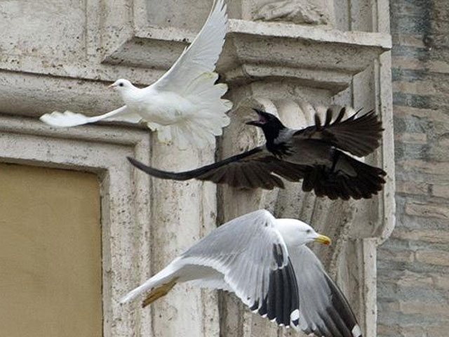 Ante la vista de miles de personas reunidas en la plaza de San Pedro, una gaviota y un cuervo negro grande se abalanzaron contra las palomas apenas fueron liberadas desde una ventana del Palacio Apostólico.