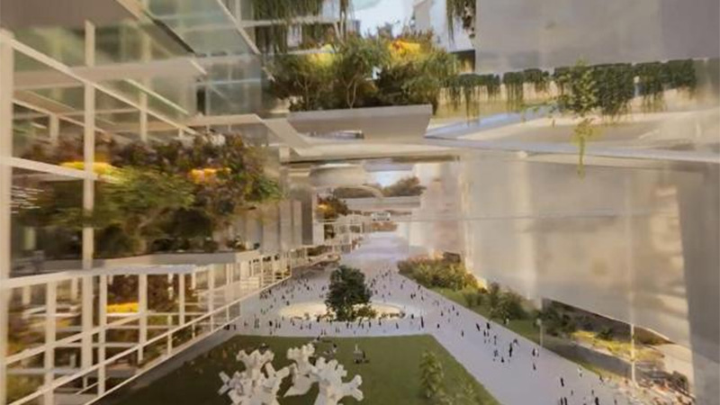 Para alimentar a sus residentes, el proyecto prevé una agricultura vertical integrada en los edificios, y los residentes pagarán una suscripción para que se les sirva el desayuno, el almuerzo y la cena. Además, un tren de alta velocidad que pasará por debajo de los edificios espejados será capaz de desplazarse de un extremo a otro en 20 minutos.