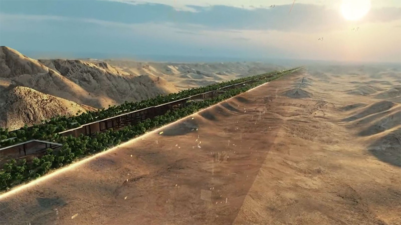 Según documentos de planificación confidenciales a los que accedió The Wall Street Journal, la construcción se ubicaría en forma de línea sobre el terreno costero, montañoso y desértico. El también denominado Mirror Line (Línea de Espejos) tendrá un costo de un billón de dólares.