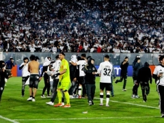 En señal de protesta, ingresaron para parar el match por lo sucedido, con cánticos también hacia los efectivos de seguridad. Los visitantes se fueron rápidamente a la zona de vestuarios y los jugadores locales trataron de calmar a sus propios fanas.