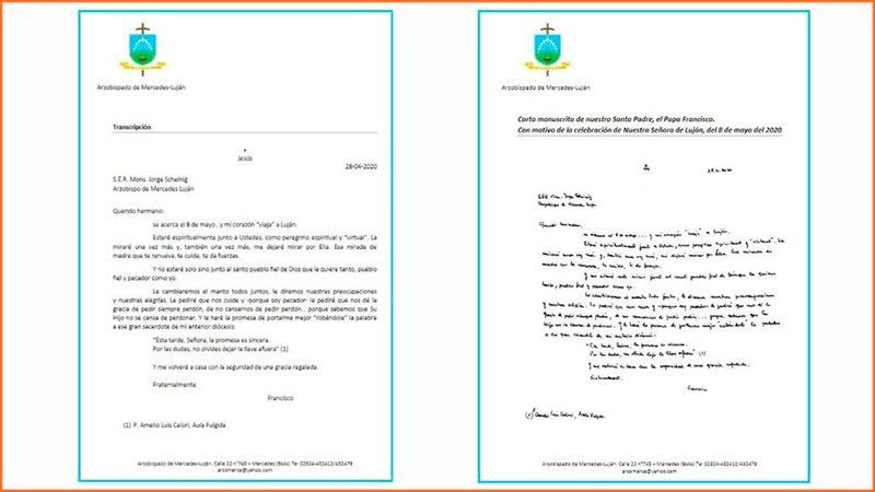 En la carta, con fecha 28 de abril, el Santo Padre expresa: "Se acerca el 8 de mayo? y mi corazón 'viaja' a Luján". Además, asegura su presencia "como peregrino espiritual y 'virtual'".