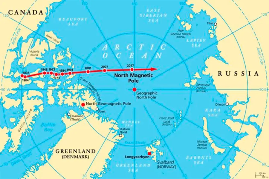 Desde su primera identificación oficial en 1831 por el explorador británico James Clark Ross en el Ártico canadiense, el polo magnético ha recorrido más de 2200 kilómetros, ubicándose actualmente más cerca de Siberia que de Canadá.
