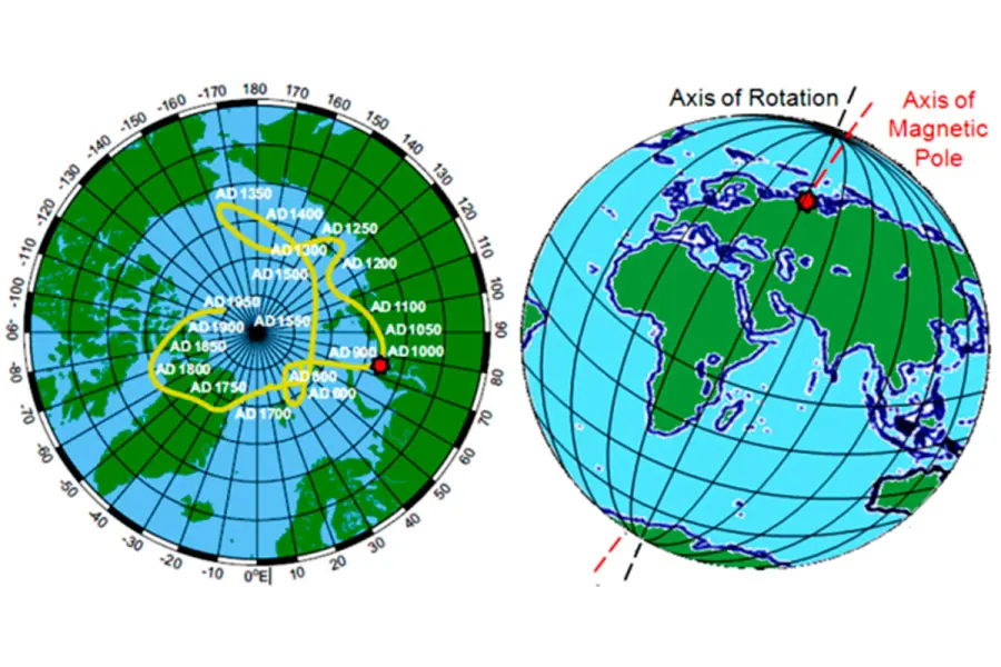 Durante las últimas décadas, el polo norte magnético aceleró notablemente su desplazamiento, pasando de moverse unos 15 kilómetros anuales a mediados del siglo XX a alcanzar velocidades de entre 50 y 60 kilómetros por año a principios del siglo XXI.