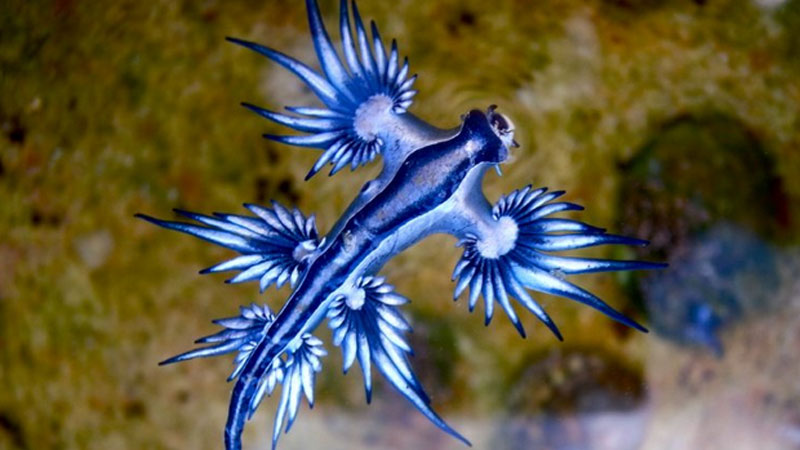 Esta criatura tan poco frecuente es considerada una de las más maravillosas del mundo. El Glaucus atlanticus, o babosa azul de mar, es mucho más pequeño que sus hermanos de la mitología tradicional, mide entre dos centímetros y medio y cinco centímetros de longitud.