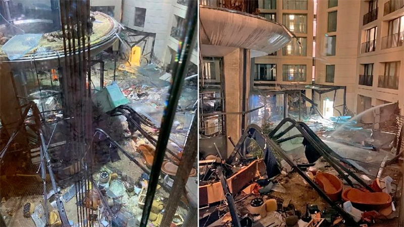 Debido a la alta presión del agua del acuario, al explotar se llevó consigo muebles, puertas, mesas y vidrios, dejando la planta baja del hotel "reducida a escombros".