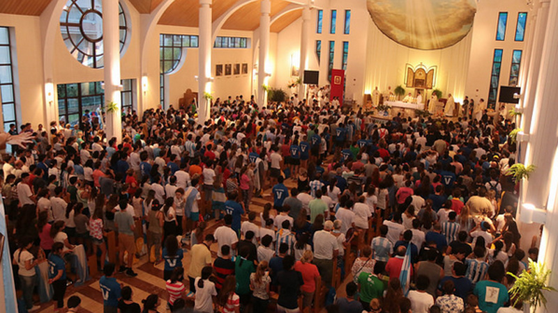 La Parroquia de Pentecostés se llenó de banderas y remeras albicelestes, donde los jóvenes argentinos se congregaron para celebrar la Eucaristía. Durante la Homilía, monseñor Tissera, resaltó la imagen de San Juan Pablo II.