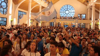 Como en todas las Jornadas Mundiales, los jóvenes argentinos se congregaron para celebrar juntos la Eucaristía. Dos horas antes de la Misa, el frente de la Parroquia de Pentecostés se llenó de banderas y remeras albicelestes.