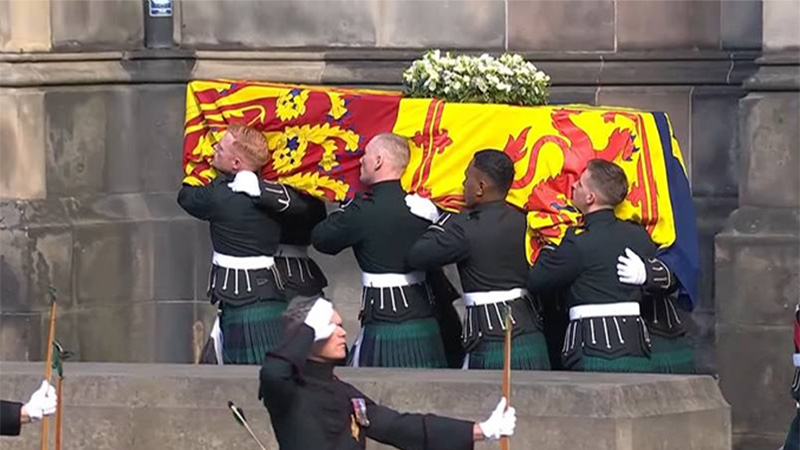 Al arribar a Londres, el próximo martes, el féretro de la reina también será puesto sobre un soporte, el cual estará cubierto por una tela púrpura en Westminster, donde comenzará la velación pública, en la que la reina estará custodiada por los miembros de su guardia real.