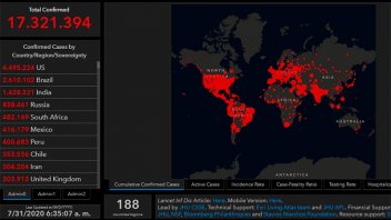 En el tercer lugar del ránking mundial se mantuvo India, con 1.582.028 pacientes infectados en total y 34.956 fallecidos, de acuerdo con datos oficiales compilados por la casa de altos estudios estadounidense.