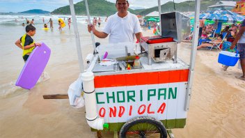 Se llama Robinson Valerio y no necesita sacar el documento para mostrar su origen: es 100 % brasileño. Alto, morocho, morrudo y casi que no sabe ni una palabra en español. Camina con su carrito por Praia Brava, el balneario surfer por excelencia del norte de Florianópolis, y parece uno más en la enorme oferta gastronómica "móvil" de la arena.