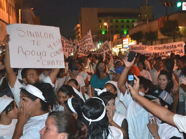 Unas 2.000 personas vestidas de blanco se manifestaron en Culiacán, la capital de Sinaloa, para pedir la liberación de Joaquín “El Chapo” Guzmán. "Joaquín Guzmán daba trabajo, no como ustedes políticos corruptos", coreaban.