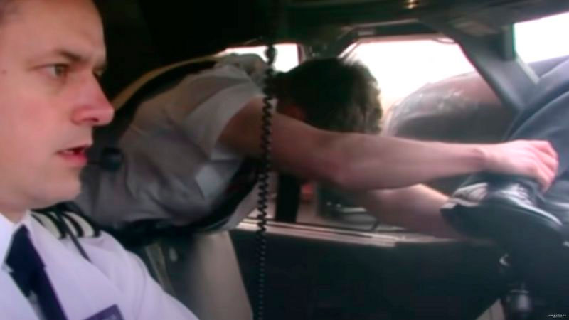 Recreación de los hechos en un documental donde se ve cómo el auxiliar toma los tobillos del piloto. Foto: (Captura)