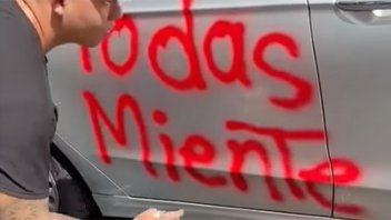 En las imágenes puede verse a un joven que pinta con aerosol rojo el auto de su ex novia. En la pintada que dejó en el vehículo, el hombre escribió: "Todas mienten".