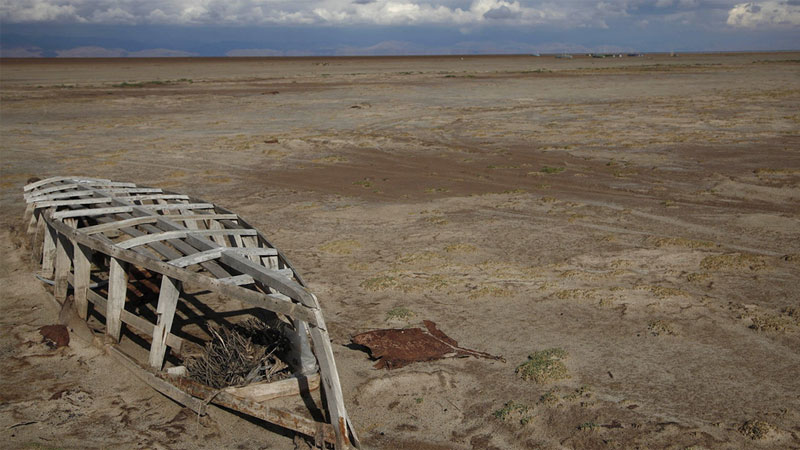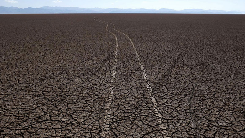 Los botes de los pescadores quedaron inutilizados. La sequía destruyó su fuente de trabajo. Las marcas de los neumáticos se ven sobre la superficie del lago.
