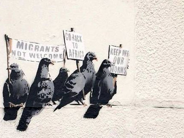 El grafiti, reproducido en el sitio de Banksy, mostraba a cinco palomas grises sosteniendo tres carteles con las frases "Vuélvete a África", "Los emigrantes no son bien recibidos" y "Mantente alejado de nuestros gusanos". Sus mensajes estaban dirigidos a otro pájaro, de color verde, que estaba aislado, en uno de los extremos del dibujo.