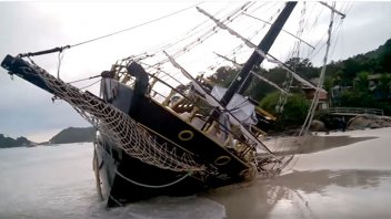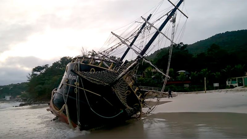 Debido a los fuertes vientos y al mar picado de los últimos días en la costa de Santa Catarina, el barco turístico encalló en una playa del sur de Brasil que es muy visitada por los argentinos. Según indicaron medios brasileños, estaba anclado en la playa de Bombinhas y fue arrastrado hasta la arena, donde quedó encallado.