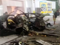 Imágenes captadas por transeúntes muestran que tanto el vehículo como la estación de servicio quedaron completamente destruidos.