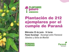 En el marco de los 212 cumpleaños de la ciudad, la Municipalidad de Paraná llevará adelante una plantación simbólica de 212 árboles nativos. La actividad se realizará el miércoles 25 de junio a las 14 horas en el Paseo Ituzaingó (ubicado sobre calle Ituzaingó, entre Florencio Sánchez y Selva de Montiel).