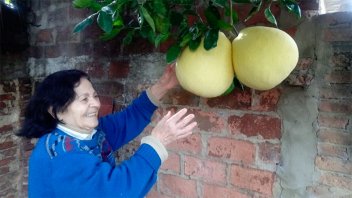 Elsa Peresutti cosecha pomelos que llegan a medir hasta 25 o 30 centímetros de diámetro. Se trataría de pomelos chinos, que son considerados "el cítrico más grande, que podría llegar a pesar hasta 5 kilos".