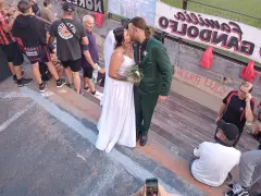 Una pareja eligió el estadio de Club Atlético Patronato para su sesión de fotos de boda y sorprendió a los hinchas antes del inicio del partido.