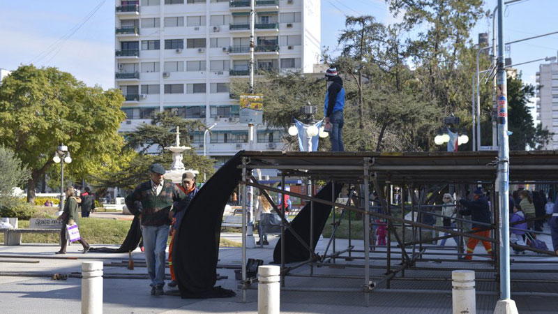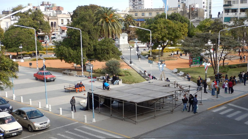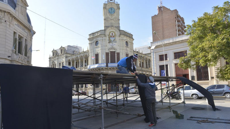 Sobre la amplia vereda de la plaza 1° de Mayo -calle Su Santidad Francisco- comenzó a armarse el escenario principal donde se realizarán distintas actividades culturales, musicales y de entretenimiento para grandes y chicos.