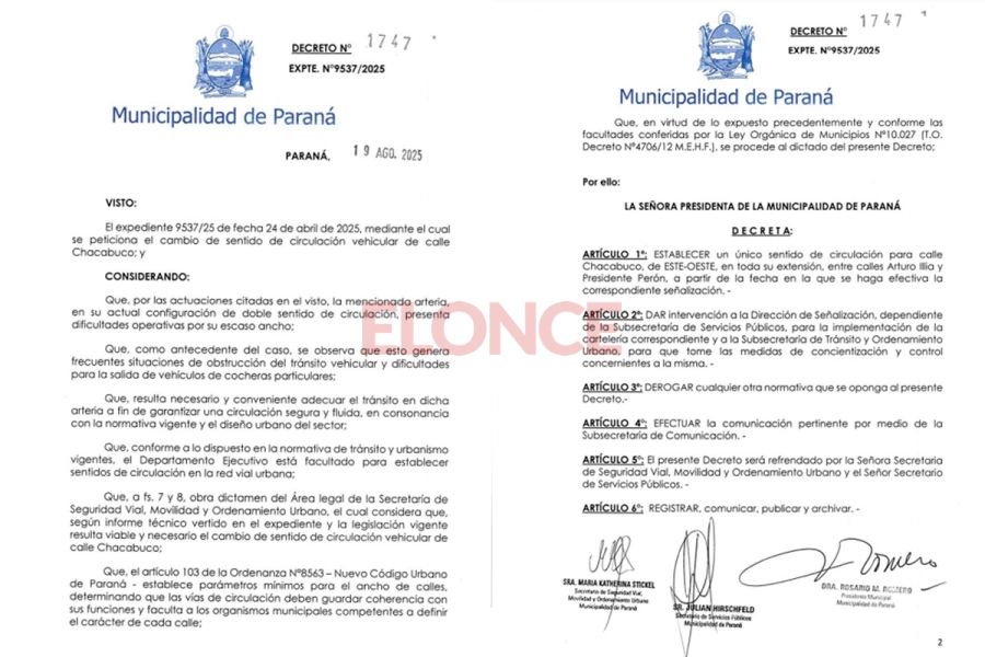 La Municipalidad de Paraná oficializó mediante el Decreto Nº 1747/2025, fechado el 19 de agosto, el cambio de circulación vehicular en calle Chacabuco, que a partir de la fecha tendrá un único sentido de Este a Oeste en toda su extensión, desde Presidente Perón hasta Arturo Illia.