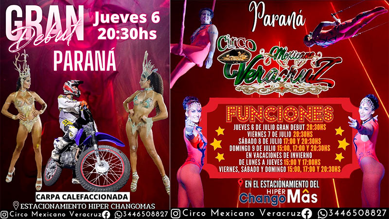 El circo mexicano Veracruz se instala en Paraná y tendrá su gran debut este viernes 7, a las 20.30. Será en el playón de estacionamiento del Híper ChangoMas, en Avenida Larramendi y Anacleto Medina de la capital entrerriana.