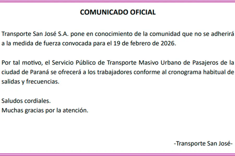 En este contexto, la empresa concesionaria del servicio de transporte urbano de pasajeros de Paraná, “Transporte San José”, emitió un comunicado en el que se refiere a la mencionada huelga impulsada por CGT. Al respecto, TSJ explicó que “no se adherirá a la medida de fuerza”, confirma en el comunicado.