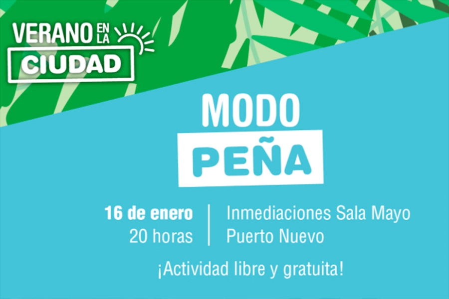 Comienza el ciclo Modo Peña verano en inmediaciones de Sala Mayo. Con acceso libre y gratuito, la primera jornada será este jueves 16 de enero a las 20. Habrá música en vivo con María Cuevas, Rama y Flor, Cristian Vivanco, Los Riedel, Ballet La Greda y la pareja de Baile Soledad Ramírez y Franco Zaragoza. Organiza la Municipalidad en el marco de la agenda Verano en la Ciudad.