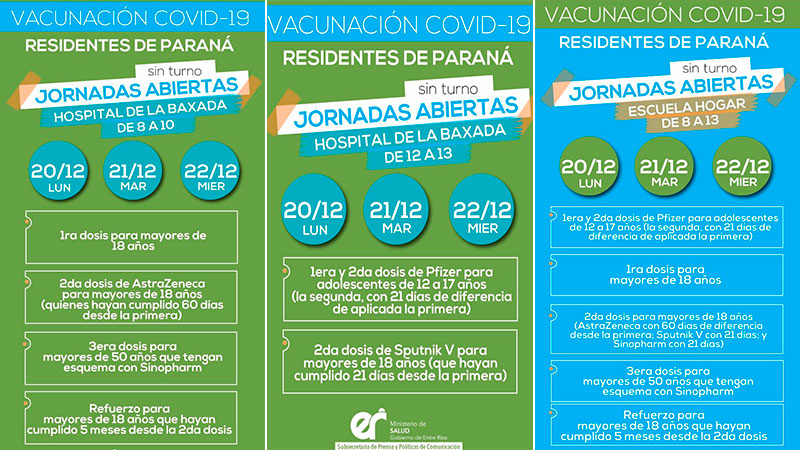 El Ministerio de Salud de Entre Ríos convocó a tres jornadas masivas de vacunación contra el covid-19 que se realizarán en Paraná, destinadas a personas residentes en la capital entrerriana.