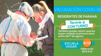 Se realizará este miércoles en la Escuela Hogar, para residentes de Paraná. Aplicarán segundas dosis de Sputnik V con turno. También podrán asistir quienes hayan recibido la primera dosis antes del 1º de agosto. Los requisitos.