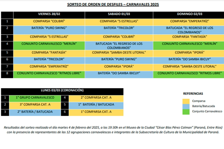 Se desarrollarán desde el viernes 28 de febrero hasta el 3 de marzo los Carnavales de Paraná 2025 en un predio que se realizará en calle Salvador Maciá, entre General Artigas y Coronel Uzin. En ese sentido, se detalló el orden de desfile de comparsas, batucadas y baterías de esta edición.