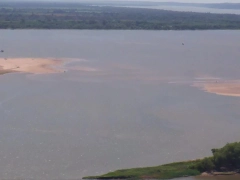 Como consecuencia de la bajante, emerge el extenso banco de arena entre las islas Curupí y la Puente, que se ubican frente a la sede de Prefectura en la ciudad de Paraná.