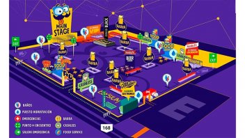Desde el staff del megaevento dieron a conocer el “mapita” que explica dónde estarán ubicados el escenario, las barras, el puesto de hidratación, el de emergencias y las salidas, entre otros.