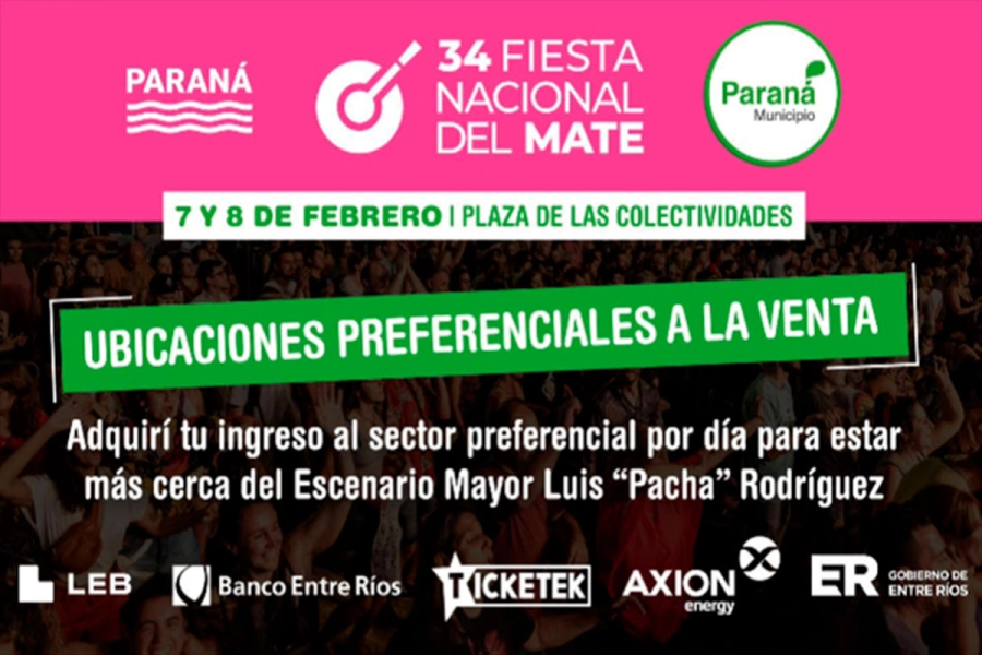 Fiesta Nacional del Mate: se venden las últimas preferenciales. Si bien la entrada general es libre y gratuita, las ubicaciones preferenciales son pases para el sector lindero al escenario, con barra y baños de uso exclusivo y cuya capacidad será de un 10% de la totalidad del espectáculo. Hay gran expectativa por la 34° edición del evento que se desarrollará el 7 y 8 de febrero en Plaza de las Colectividades.