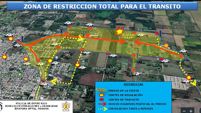 • Ingreso de remises y taxis habilitados: Los taxis y remises de la ciudad de Paraná, que realicen el servicio de traslado hacia la fiesta, deben estar habilitados para tal fin. Todos sus ocupantes deben tener la pulsera colocada. Para dirigirse al predio, deberán tomar por Almirante Brown hasta llegar a la colectora Este de Circunvalación, allí tomar hacia el norte, por Lopez Jordán hasta la colectora de la Ex. PDV, los pasajeros deben descender, y el vehículo retomar por Bazán y Bustos hacia Brown nuevamente.