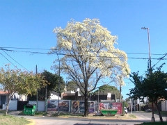 Un imponente lapacho blanco ya florece con todo su esplendor en la esquina de Avenida Ejército y calle O´Brien, en Paraná, transformándose en un punto de atracción para vecinos y transeúntes. El ejemplar, que supera las dos décadas de vida, florece desde los primeros días de agosto y se mantiene en este estado hasta mediados de septiembre, cuando comienza a dar hojas nuevas y los primeros frutos.