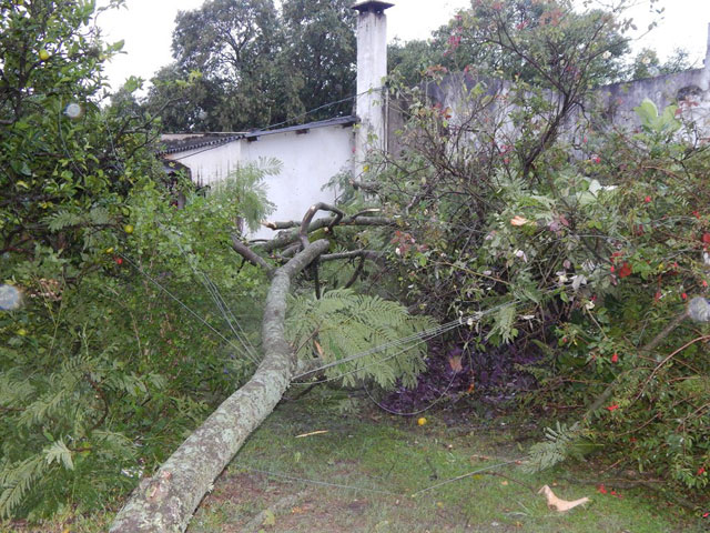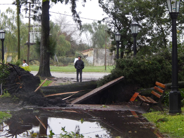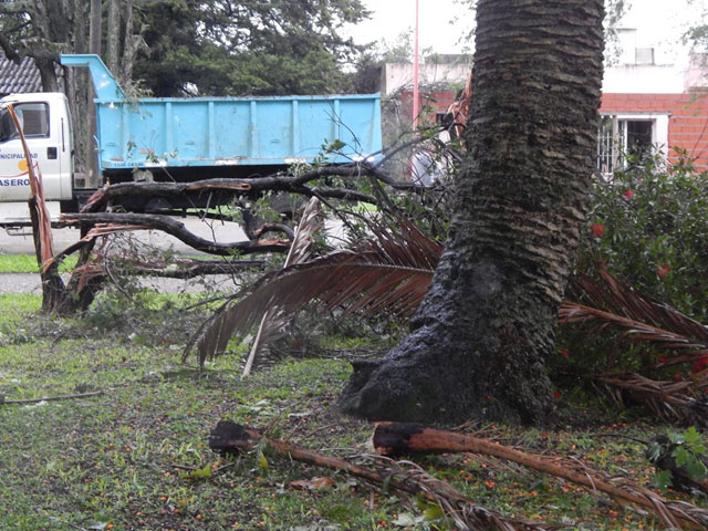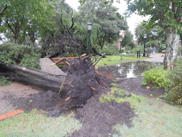 La fuerte tormenta registrada este martes por la madrugada en Caseros provocó severas destrucciones en la plaza principal, calles y viviendas aledañas. Según se informó, personal del Área de Espacios Verdes del Municipio de Caseros se encuentra abocado a las tareas de limpieza y recolección de ramas y árboles que han sido arrancados de raíz por el intenso viento. La responsable del área, María Laura Sturt señaló: “Los destrozos en la plaza se pueden estimar en un 50%, entre los cuales se encuentran ramas quebradas, 3 especies de árboles añejos arrancados de raíz, otros quebrados por la mitad además de las farolas, bancos y veredas destruidas por éstas caídas”.