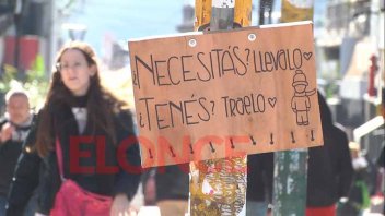 ¿Necesitás? Llévalo / ¿Tenés? Tráelo, indica el cartel de un perchero solidario que fue instalado sobre Peatonal San Martín, a la altura de su intersección con calle Urquiza, registró Elonce.
